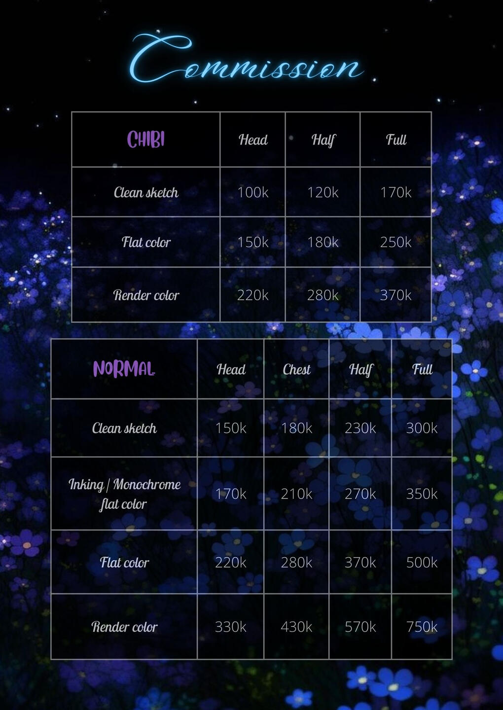 Về deadline, ít nhất 1-2 tháng đối với comm Render Color và 1 tuần với những loại comm còn lại.